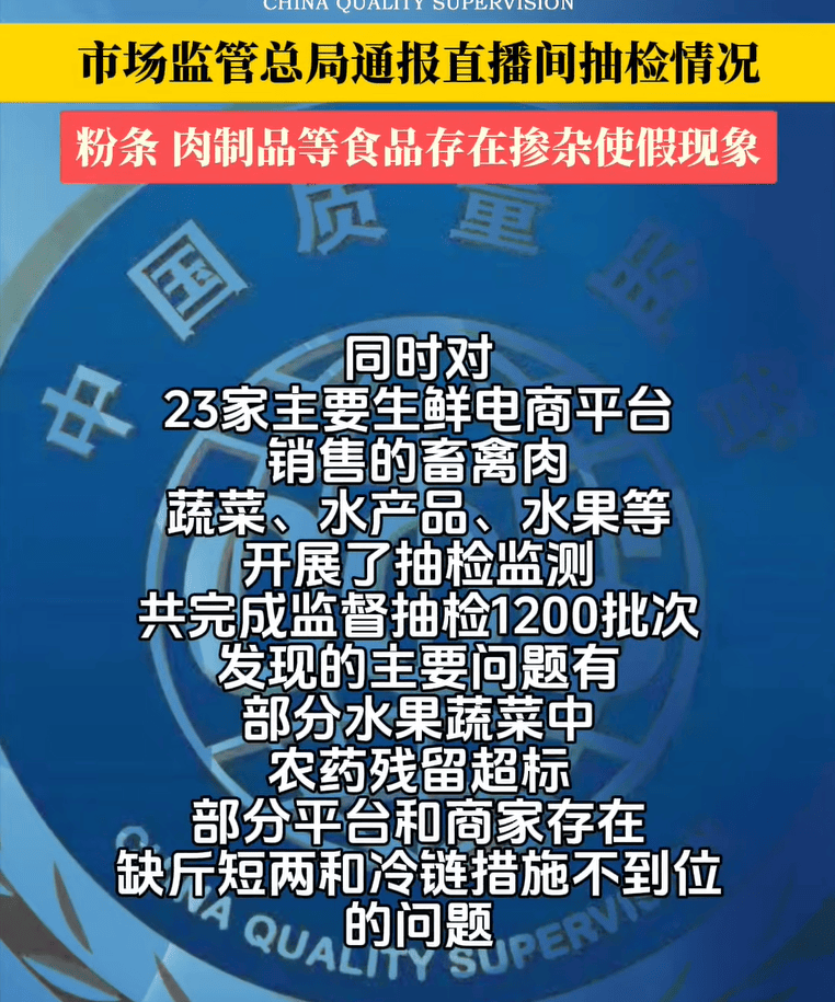 然而,比来国度市场监视总局对多个收集曲播平台进行了抽检,发觉了一些不及格商品。例如正在1042个曲播间的监测中,1492批次的食物中,粉条、粉丝、肉成品等存正在掺假的现象。此外,对于生鲜电商平台的禽畜肉、蔬菜、生果、水产物也进行了1200批次的监测,还有的存正在分量不脚或冷链不达标的问题。